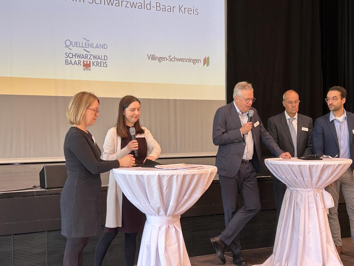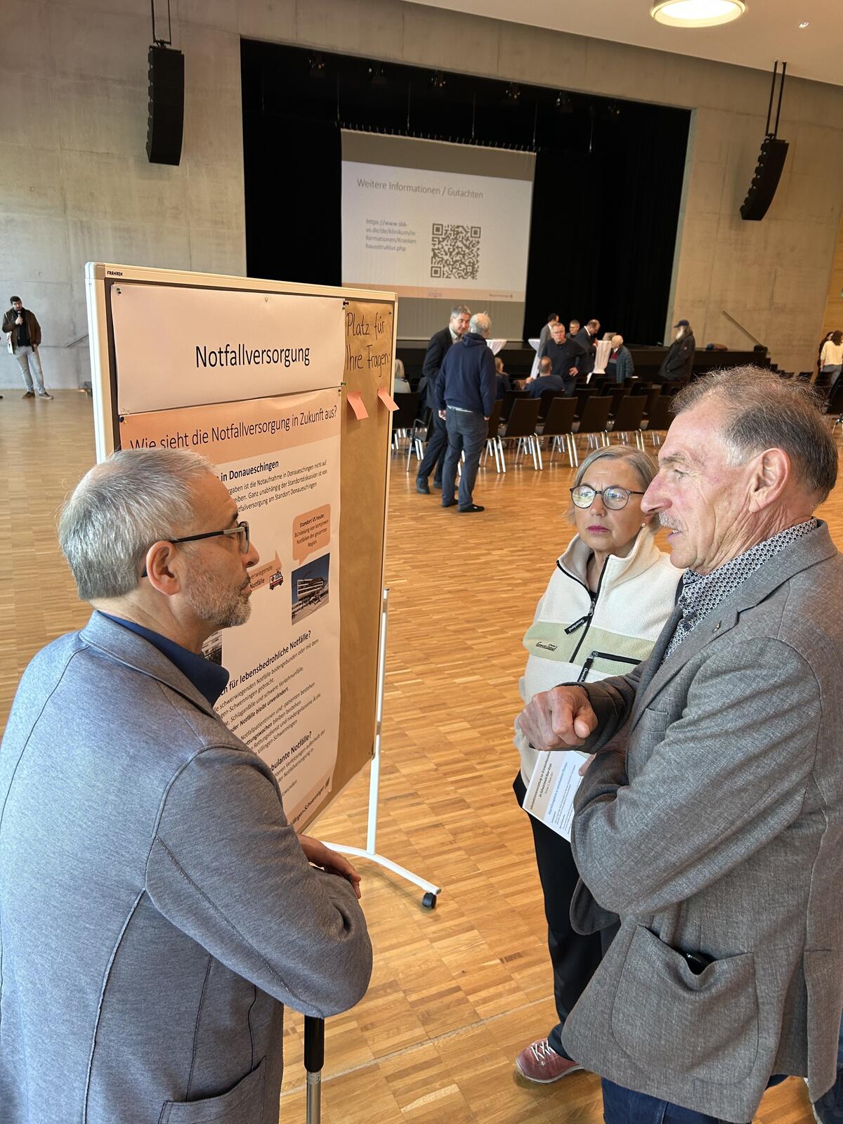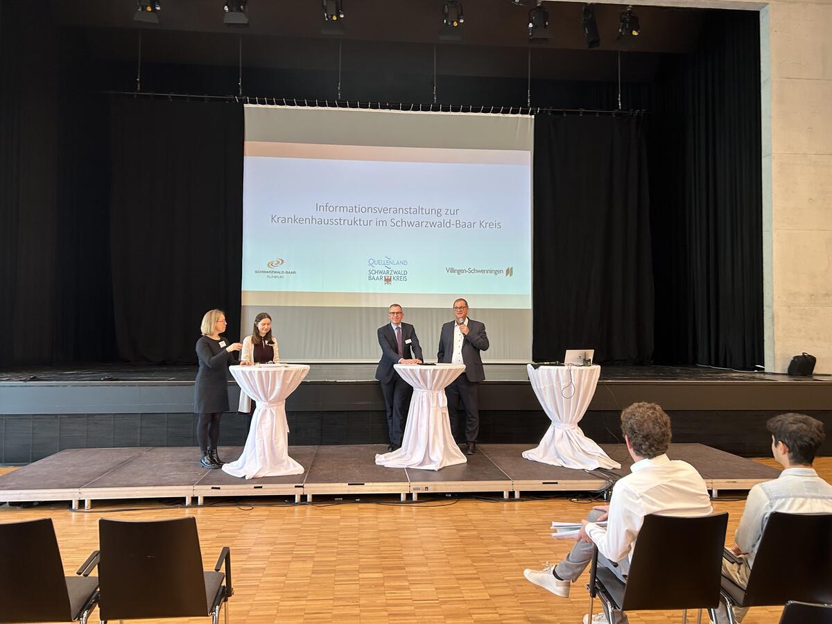 Zur Krankenhausstruktur im Schwarzwald-Baar-Kreis informierten am Samstag (11. Oktober) das Schwarzwald-Baar Klinikum, die Stadt Villingen-Schwenningen und das Landratsamt Schwarzwald-Baar-Kreis bei einer moderierten Infoveranstaltung in der Neckarhalle in VS-Schwenningen. Nach einer gemeinsamen nichtöffentlichen Sitzung des Kreistages und des Gemeinderates der Stadt Villingen-Schwenningen begrüßten Landrat Sven Hinterseh und Oberbürgermeister Jürgen Roth die Bürgerinnen und Bürger. Dr. Matthias Geiser, Geschäftsführer des Schwarzwald-Baar Klinikums, Dr. Matthias Henschen, ärztlicher Direktor und Jonathan Unger, Gesundheitsökonom des Gutachterbüros wmc erläuterten im Interview den aktuellen Stand und was sich verändern wird. Veränderungen wird es am Klinikstandort Donaueschingen geben. Konkret werden mehrere Abteilungen vom Standort Donaueschingen an den Standort Villingen-Schwenningen umziehen. Dies sind das Lungenzentrum mit seiner Intensivmedizin und die Altersmedizin. Diese Entscheidung hat der Aufsichtsrat vor kurzem getroffen. Außerdem wird es künftig keine Notaufnahme mehr am Standort Donaueschingen geben.