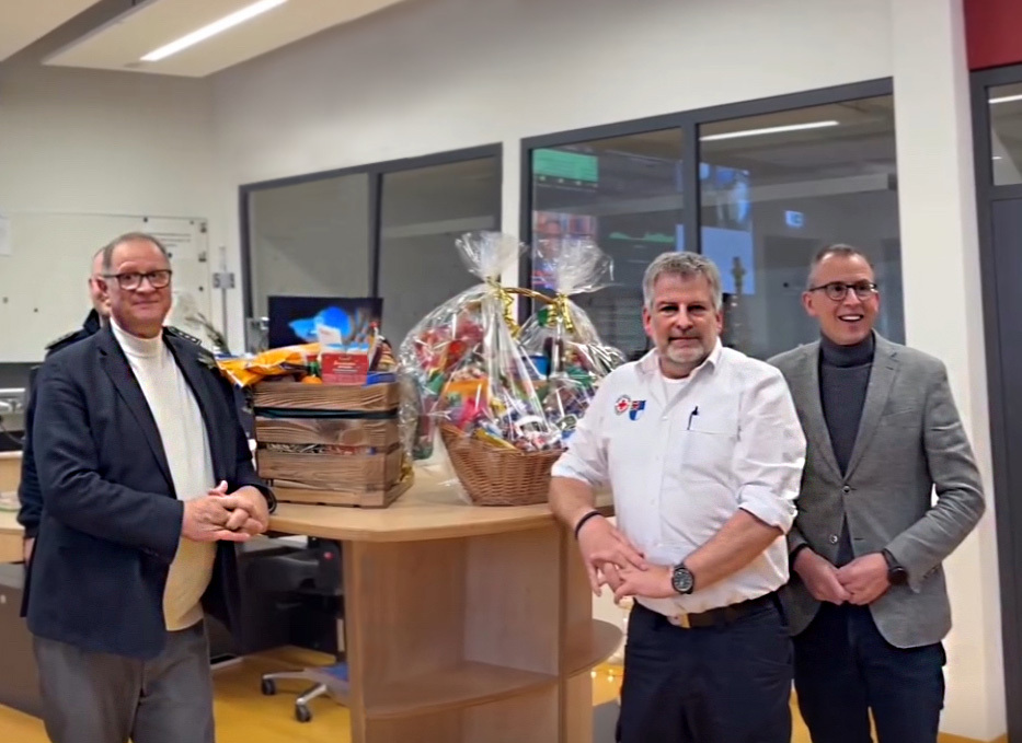 Kurz vor den Feiertagen besuchten Landrat Sven Hinterseh und Oberbürgermeister Jürgen Roth die Integrierte Leitstelle im Schwarzwald-Baar-Kreis. Als Dank für ihren unermüdlichen Einsatz im vergangenen Jahr übereichten beide einen Präsentkorb an die Mitarbeitenden. Die Leitstelle ist rund um die Uhr an 365 Tagen im Jahr über die Notrufnummer 112 erreichbar und koordiniert jährlich mehr als 70.000 Einsätze im Schwarzwald-Baar-Kreis. Als zentrale Schaltstelle alarmiert sie alle Hilfs- und Rettungsorganisationen: die Freiwilligen Feuerwehren, das Deutsche Rote Kreuz, den Malteser Hilfsdienst, den Arbeiter-Samariter-Bund, die Johanniter-Unfall-Hilfe, die Psychosoziale Notfallversorgung, die Bergwacht, das DLRG sowie das Technisches Hilfswerk. Darüber hinaus sind in der Leitstelle auch die Brandmeldeanlagen eingebunden, wie man sie häufig in Betrieben findet.