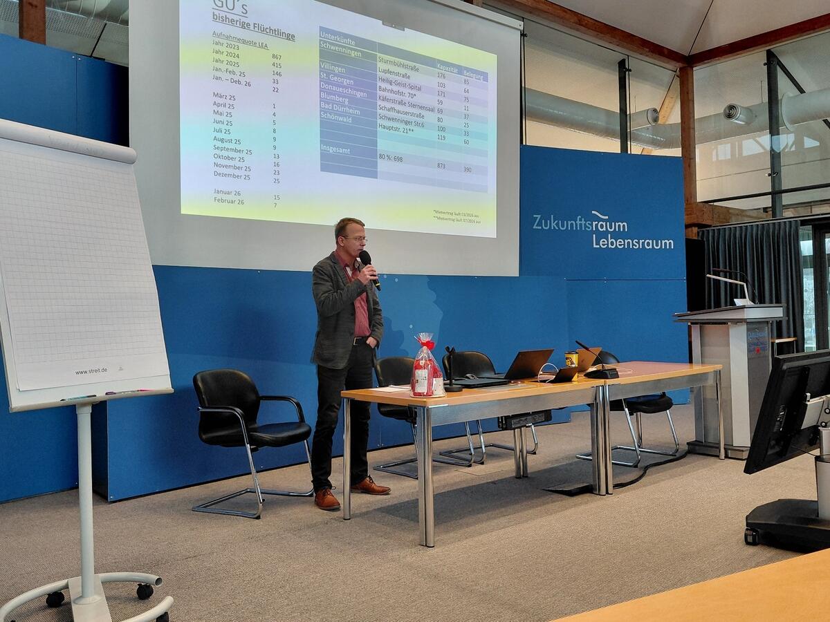 Jan Hauser, Leiter des Amtes für Soziale Sicherung, Pflege und Teilhabe des Landratsamtes Schwarzwald-Baar-Kreis begrüßte die Teilnehmer und informierte über die aktuellen Zuweisungen von geflüchteten Menschen in den Schwarzwald-Baar-Kreis, über die Gemeinschaftsunterkünfte des Landkreises und über die aktuellen Zuweisungen in die Anschlussunterbringungen.