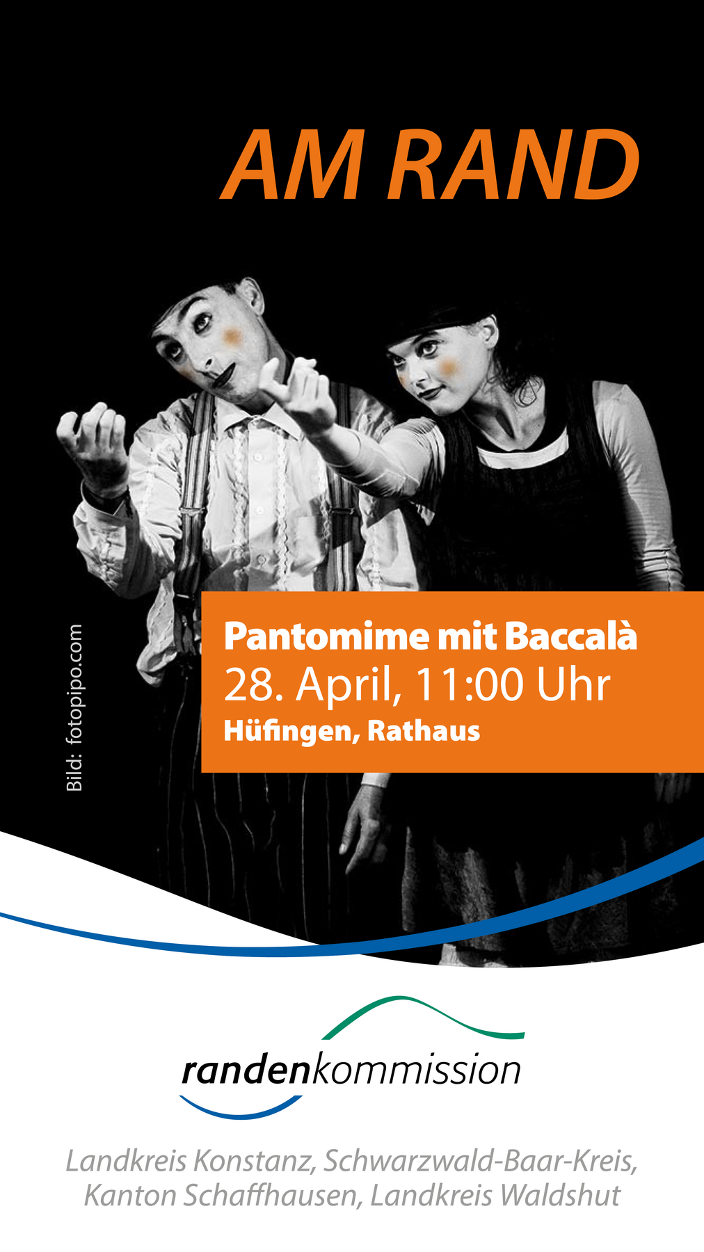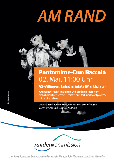 Das Schweizer Pantomime-Duo Baccalà erzählt ohne Worte vom Menschsein. Spontan. Hintergründig. Amüsant. Zu sehen ist das rund 30-minütige Stück mit dem Titel „Am Rand“ auf den Straßen in neun Orten der Landkreise Waldshut, Konstanz und Schwarzwald-Baar-Kreis sowie im Kanton Schaffhausen.