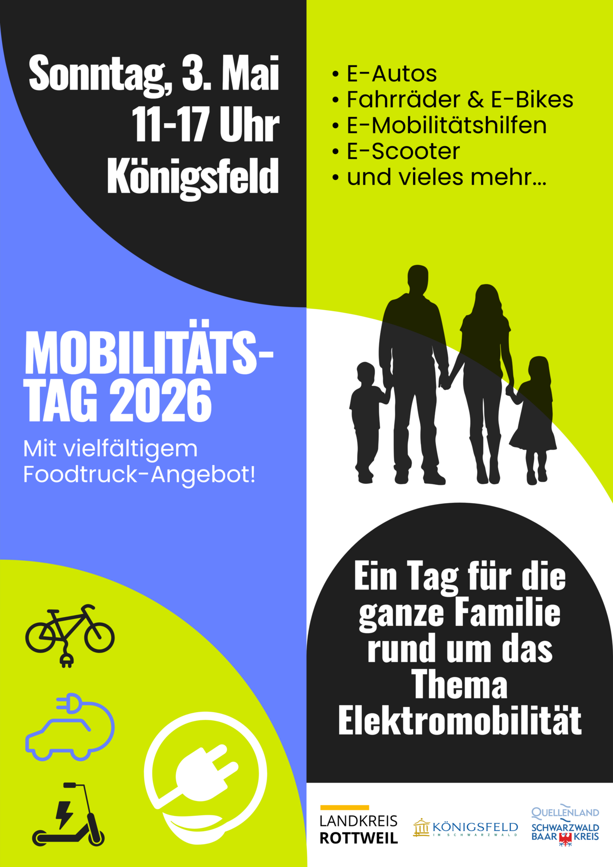 Rund um den Königsfelder Zinzendorfplatz und den Busbahnhof wird der Mobilitätstag durch die Landkreise Schwarzwald-Baar-Kreis und Rottweil in Kooperation mit der Gemeinde Königsfeld organisiert. Dabei dreht sich alles um die Zukunft der Fortbewegung – unter dem Motto „Elektrisch unterwegs – die Zukunft entdecken“. Die gesamte Bandbreite moderner Elektromobilität wird durch Autohäuser, Fahrradgeschäfte, Anbieter von E-Mobilen und Energieversorger präsentiert. Aufklärungsarbeit zum Thema Brandschutz und Umgang mit Elektromobilität leistet die Freiwillige Feuerwehr Königsfeld, in Zusammenarbeit mit der Gewerbeschule. Der ADCF (Allgemeiner Deutscher Fahrrad Club) beteiligt sich mit einer Codier-Aktion für Fahrräder. Auch der VCD (Verkehrs-Club Deutschland) ist mit Vorführungen vor Ort.